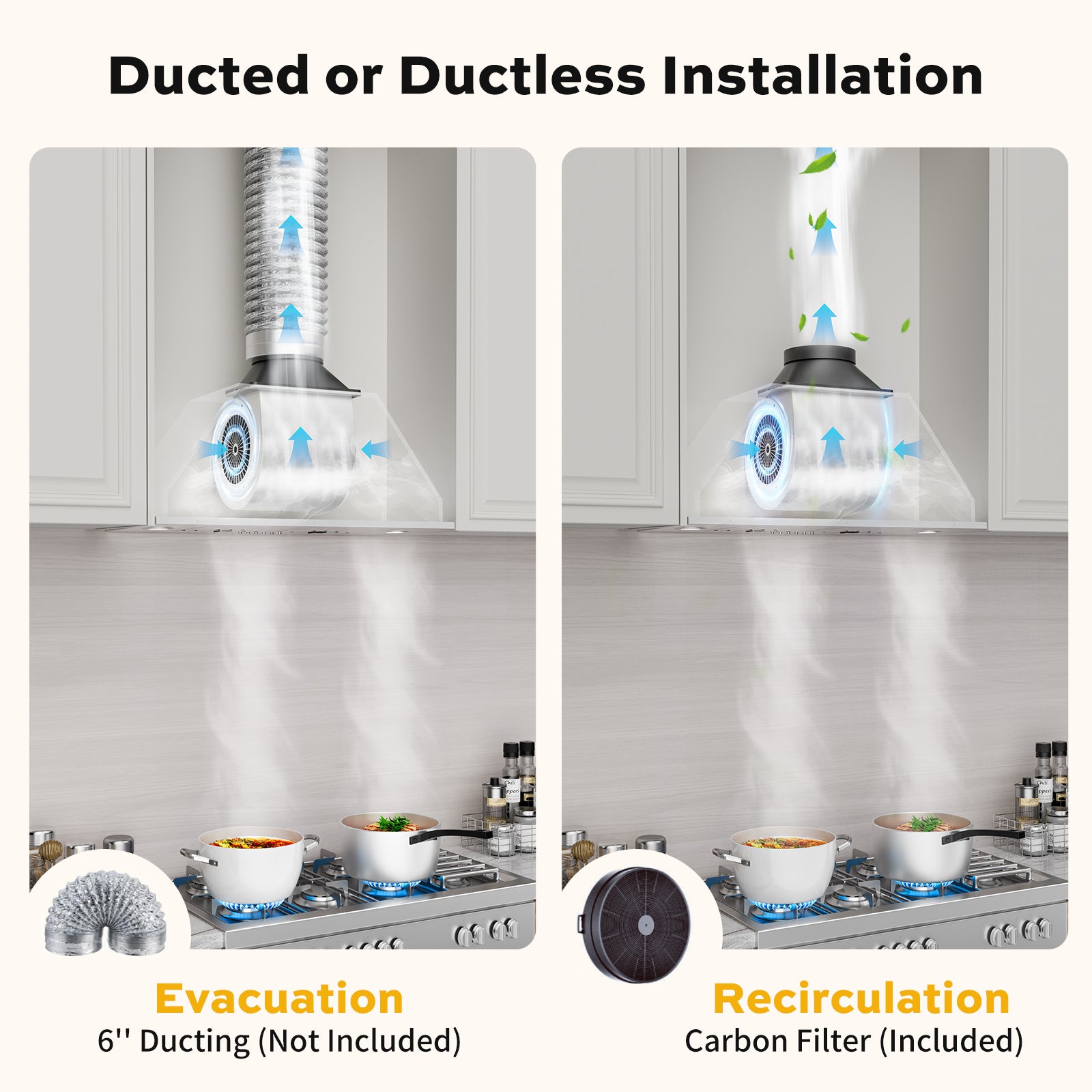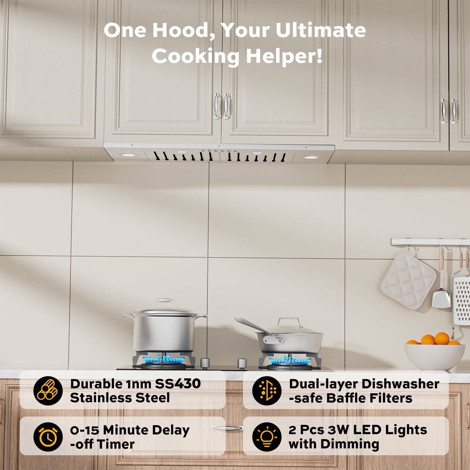 This range hood offers 900 CFM airflow, removing 98% of smoke and odors. It features quiet 35-65 dB operation, four-speed push-button controls, and versatile ducted or ductless installation with a charcoal filter. Includes adjustable LED lights, dishwasher-safe baffle filters, durable SS430 steel, a 1–15 min timer, safety certifications, and long warranties (motor: 10 years, lights/controls: 5 years).