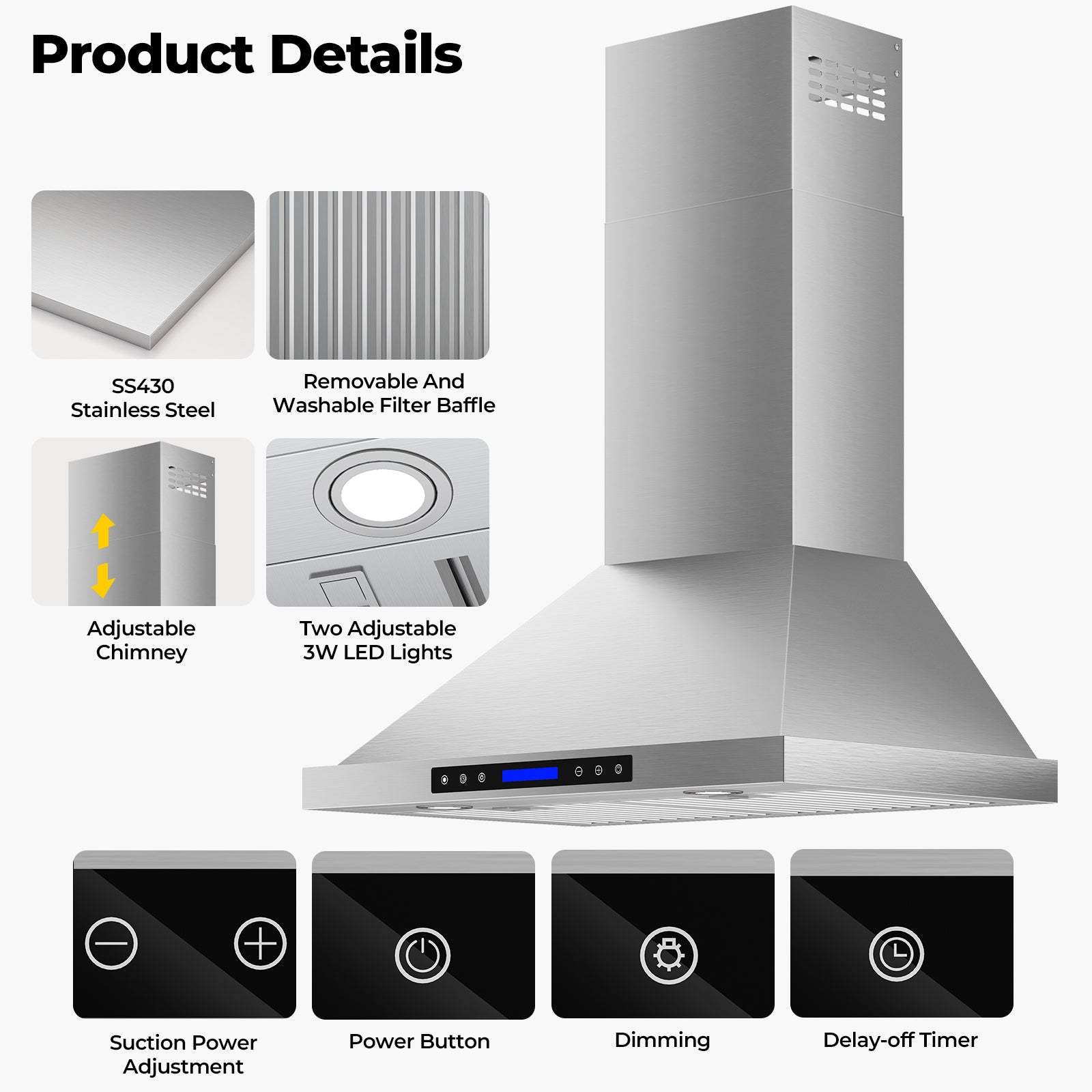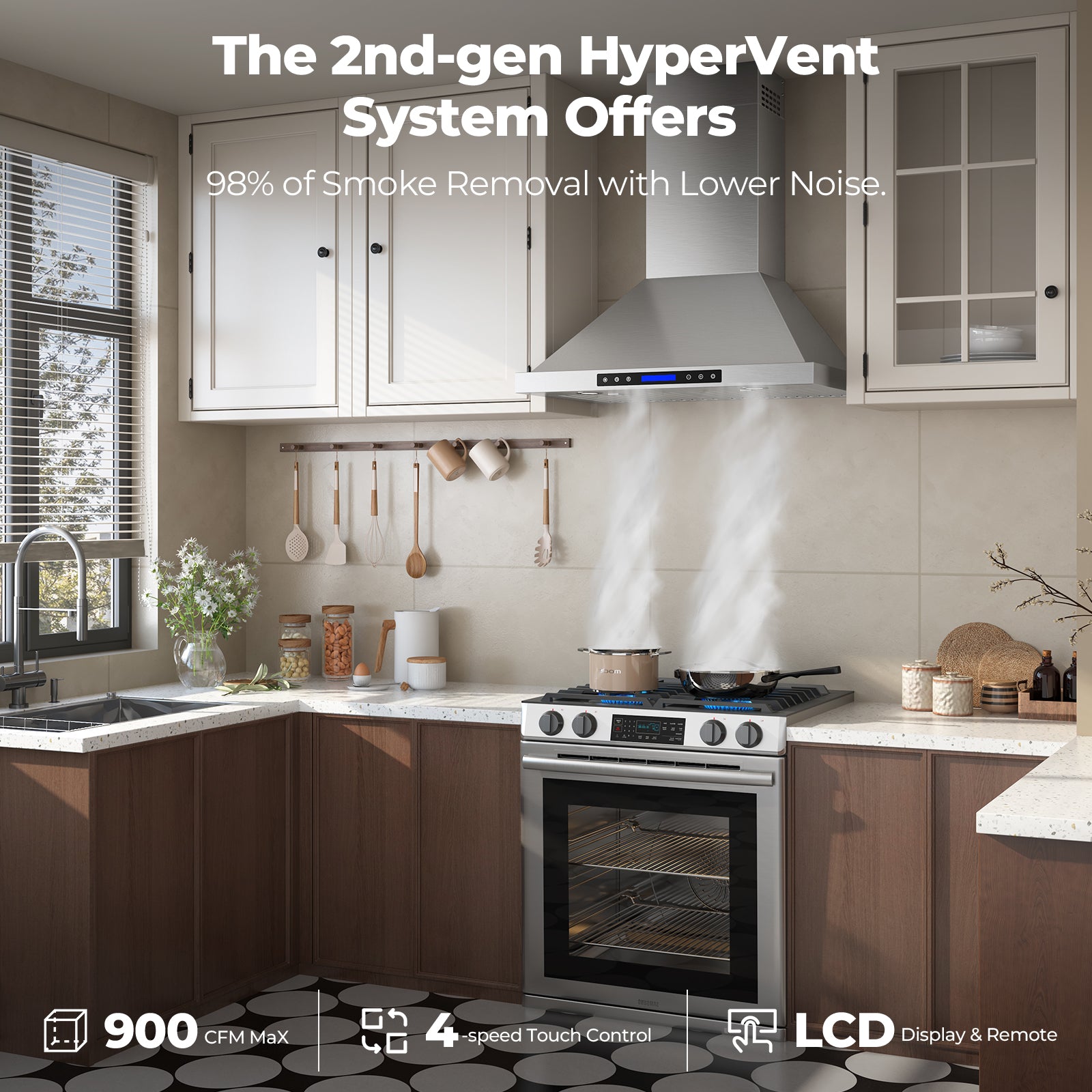 This 900 CFM range hood removes 98% of smoke and odors, featuring four-speed touch controls with LCD and remote, quiet operation (39–65 dB), and convertible ducted or ductless installation (6'' ducting included). Made of durable SS430 steel, it has adjustable LED lights, dishwasher-safe baffle filters, a 1–15 min timer, ETL/CETL certified, and offers long warranties with 24/7 support. Accessories included.