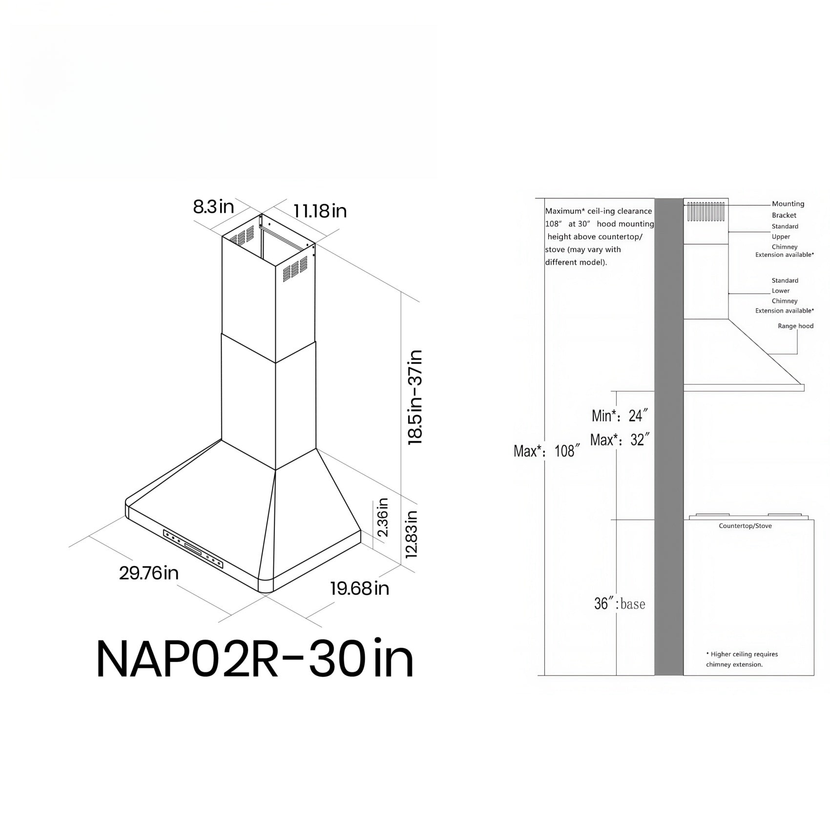 This 900 CFM range hood removes 98% of smoke and odors, featuring four-speed touch controls with LCD and remote, quiet operation (39–65 dB), and convertible ducted or ductless installation (6'' ducting included). Made of durable SS430 steel, it has adjustable LED lights, dishwasher-safe baffle filters, a 1–15 min timer, ETL/CETL certified, and offers long warranties with 24/7 support. Accessories included.