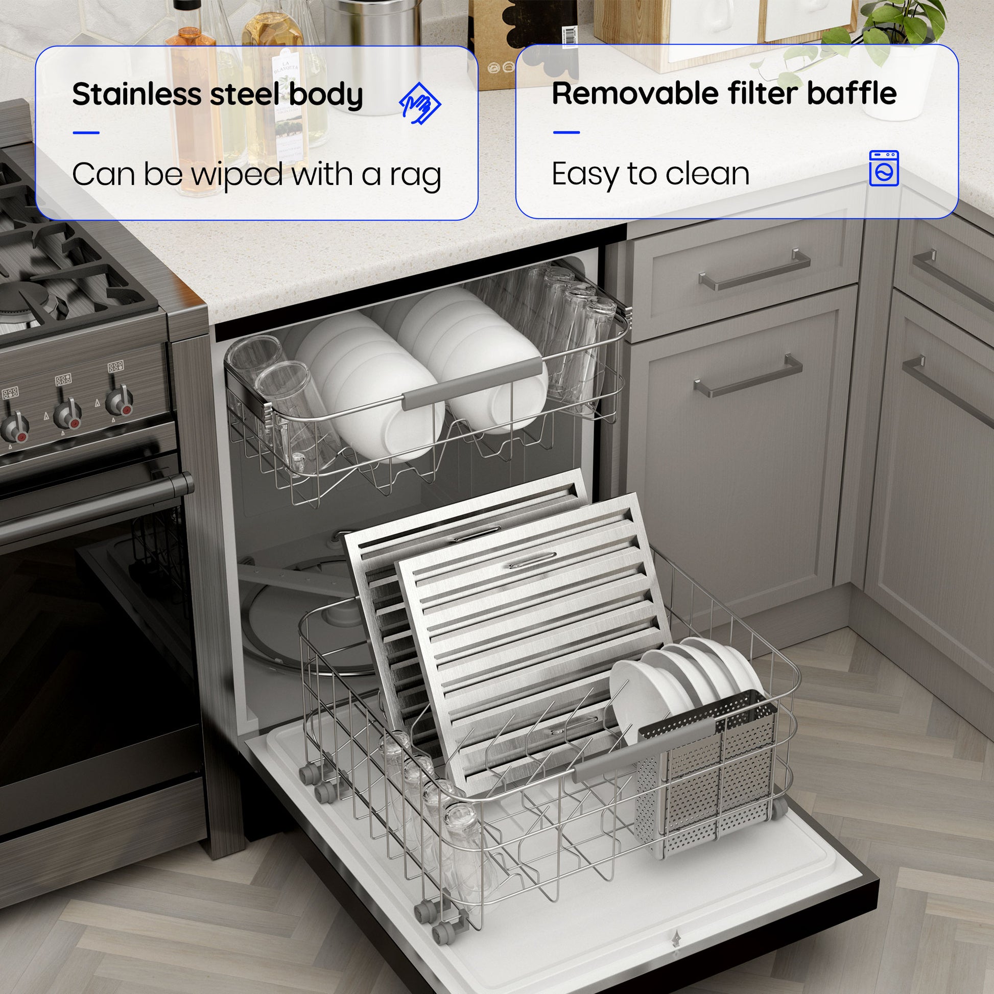 This range hood offers a maximum airflow of 900 CFM, effectively removing up to 98% of smoke and cooking odors from kitchen stove and oven, with four-speed touch controls, an LCD display, and a remote for easy adjustments. The vent hood operates quietly at just 39 dB on the lowest setting and 65 dB at the highest. The unit features two adjustable 3W LED lights for warm, customizable illumination, and two dishwasher-safe stainless steel baffle filters for easy maintenance. Made from high-quality SS430 stainless steel, it combines durability with elegance. Additional features include a 1–15 minute adjustable timer with delayed shut-off, ETL and CETL safety certifications, and a comprehensive installation manual. The product is backed by a 10-year warranty for the motor and blowers, as well as a 5-year warranty for the LED lights and controls. Customer support is available via email (support@ekonkitchen.com).