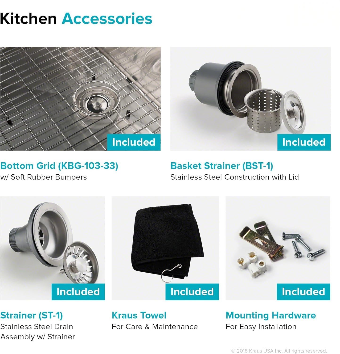 - KIT INCLUDES: Kitchen sink, grids (x2), drain (x2), mounting hardware, cutout template, kitchen towel