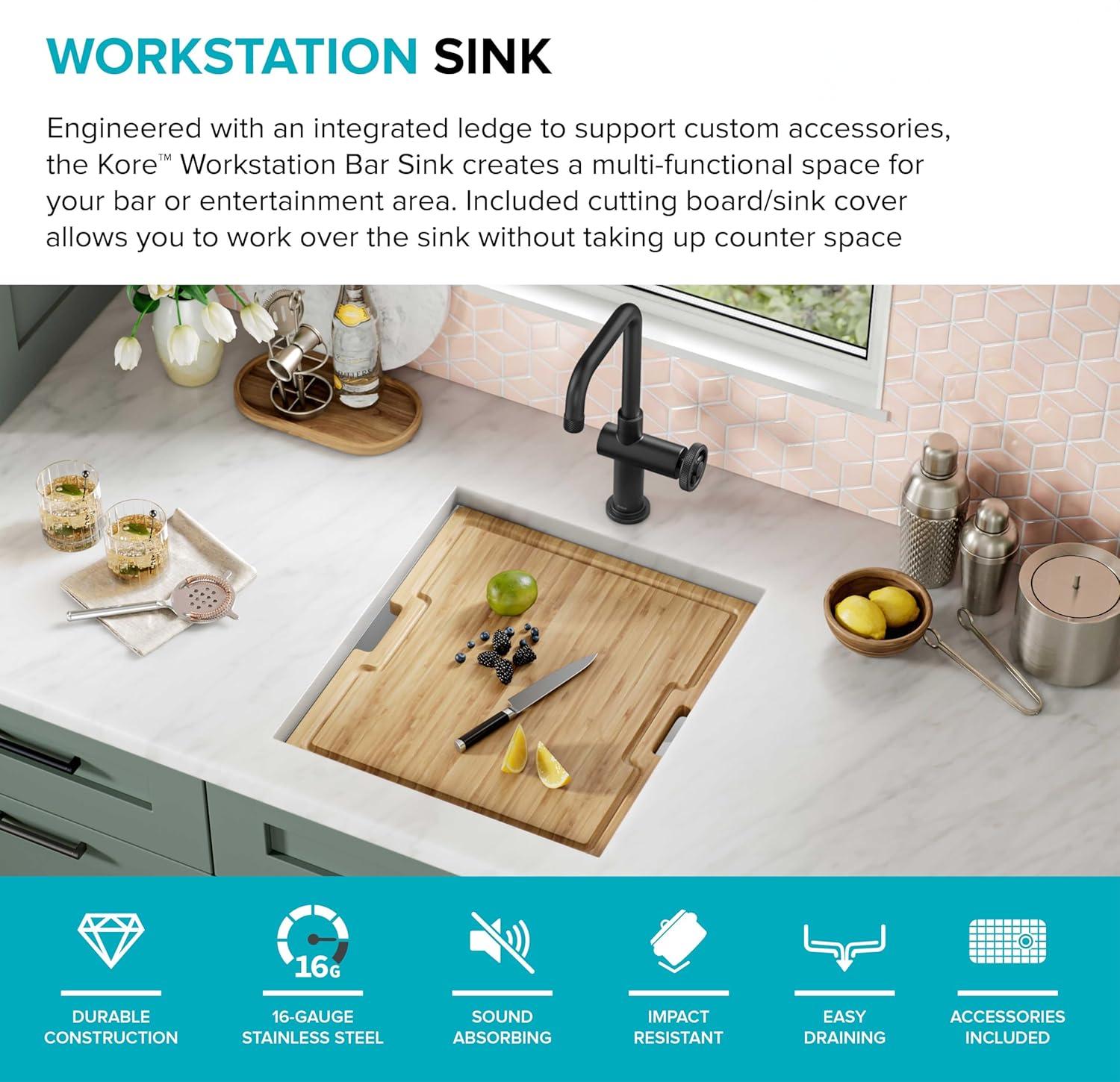 - WORKSTATION BAR SINK with integrated ledge for accessories and compact design offers all the functionality of a workstation in any size of kitchen – perfect for adding a modern touch to a bar or entertainment area