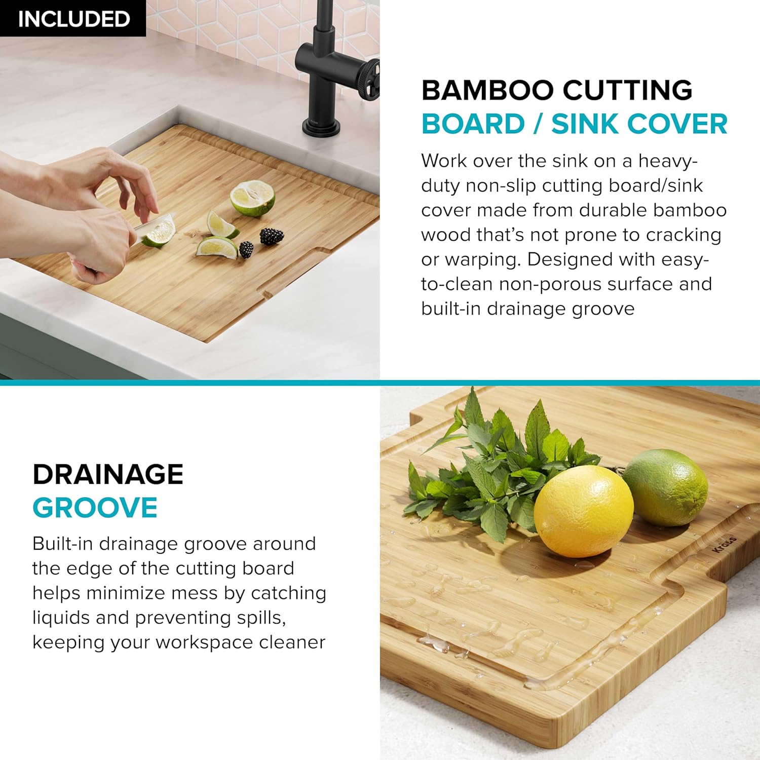 - KIT INCLUDES: Sink for kitchen, cutting board / sink cover, protective bottom grid, drain assembly with cover, hardware, template