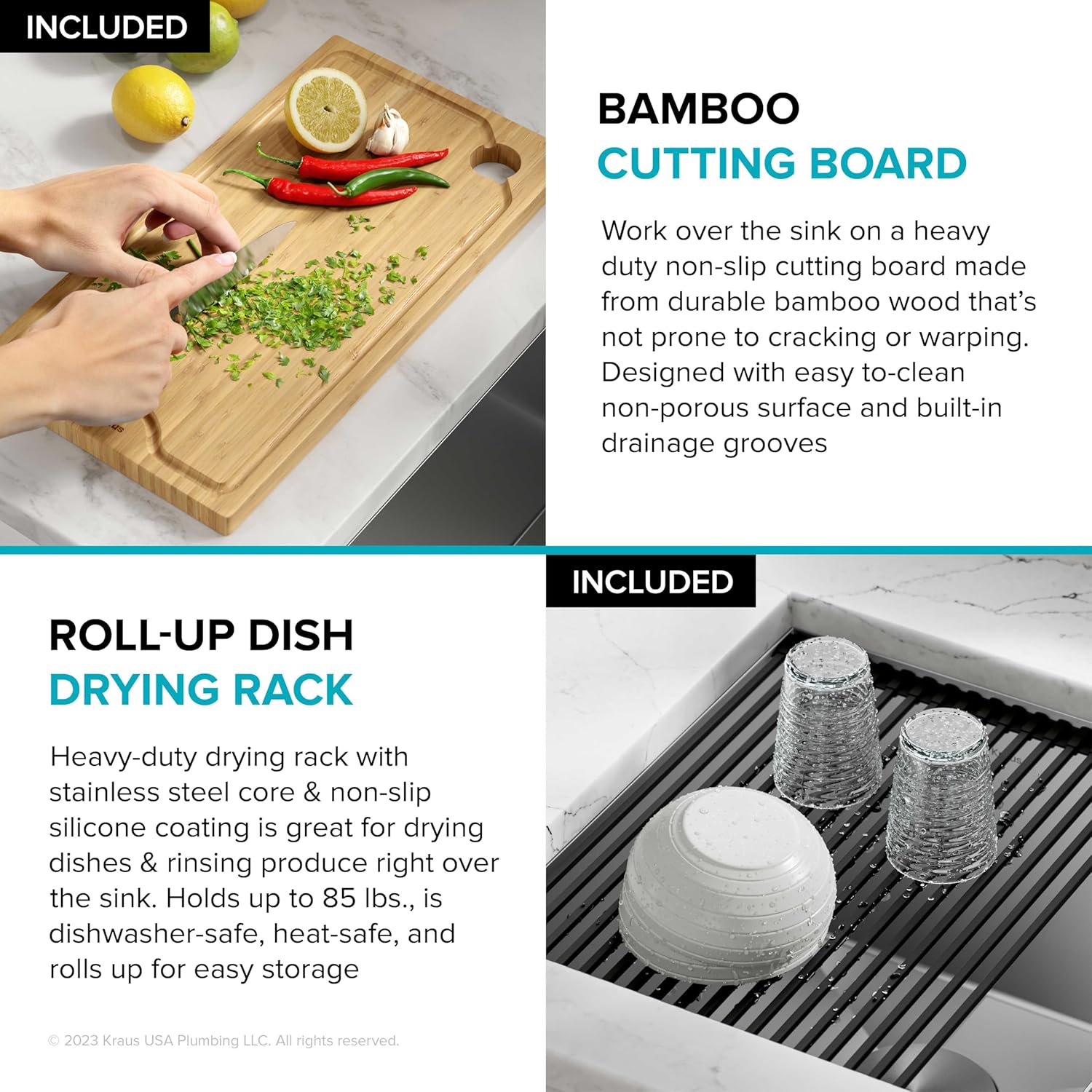 - WORKSTATION SINK with integrated ledge for sliding accessories allows you to work right over the sink while minimizing clutter on the kitchen counter – Chop and slice on the durable bamboo cutting board or dry dishes on the heavy-duty rolling mat